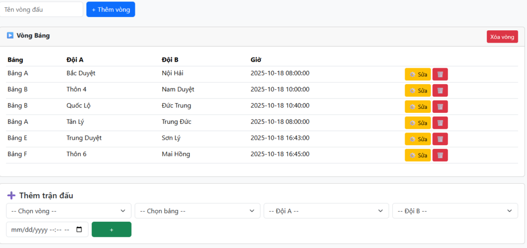Trong quản lý có phần tạo bảng, xếp đội