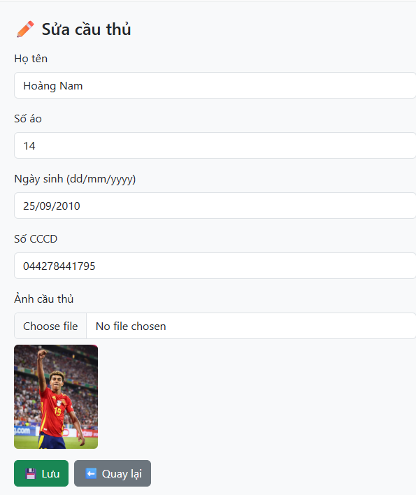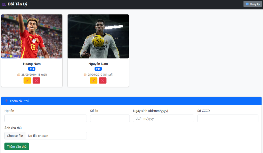 Thêm cầu thủ bao gôm, tên, ngày tháng năm sinh, số CCCD (số này ẩn với người xem, chỉ BTC mới xem được). Hỗ trợ up ảnh cầu thủ, số đeo.